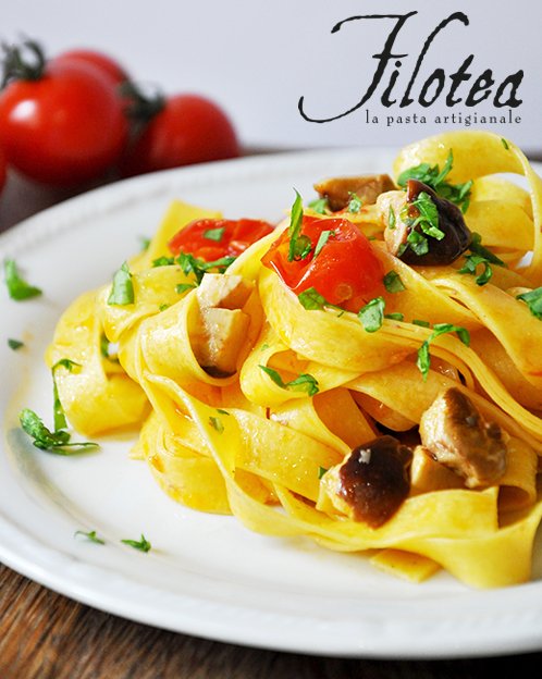 Cook the Tagliatelle Filotea in plenty of salted boiling water for 3 minutes, drain the egg pasta and toss it in the pan with the sauce, just long enough to mix all the ingredients.