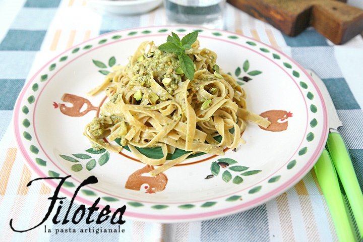 Cuocete le Fettuccine al Farro Filotea in abbondante acqua salata per 4 minuti, scolate la pasta all’uovo e amalgamatela con il pesto di zucchine e pistacchi.